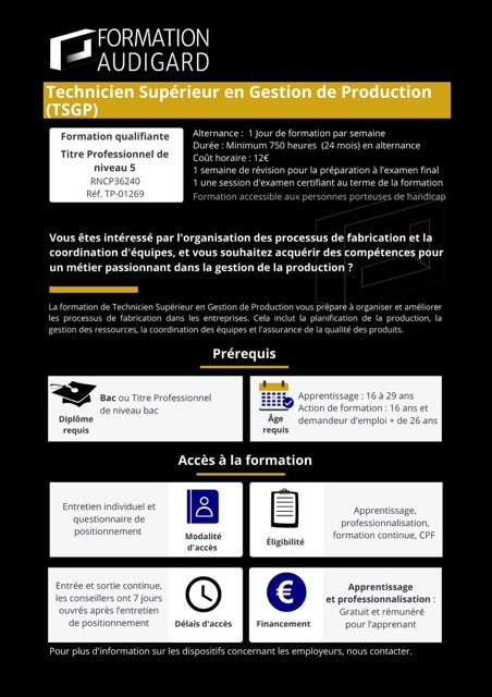 En tant que Technicien Supérieur en Gestion de Production vous optimiserez la production en veillant à ce que les ressources matérielles, humaines et temporelles soient utilisées de manière efficace pour atteindre les objectifs de qualité, de quantité et de délais fixés par l’entreprise.